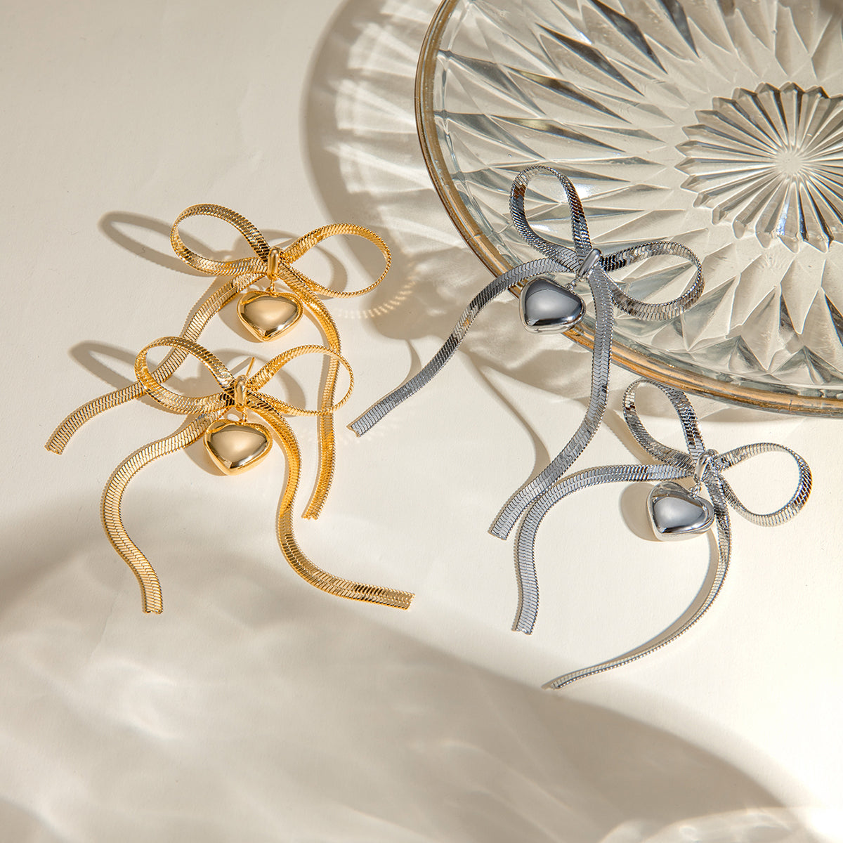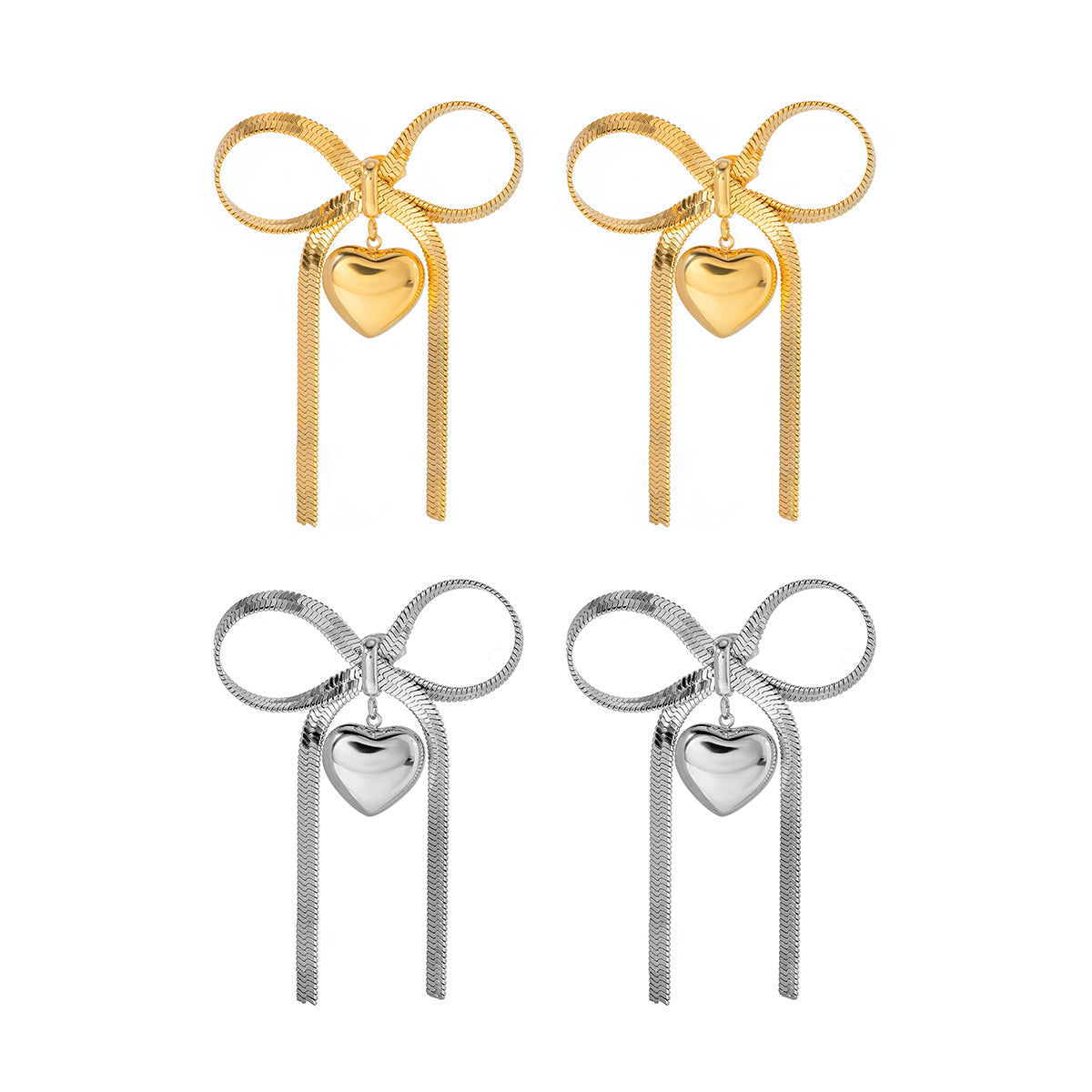 The Bow Heart Drop Earrings bring soft romance with a confident edge. Crafted in a high-polish gold or silver finish, these statement studs feature a delicate bow silhouette with a smooth heart charm and flowing chain drops that catch the light with every move. Durable, tarnish-resistant, and made for everyday wear, they give you standout style without the stress.