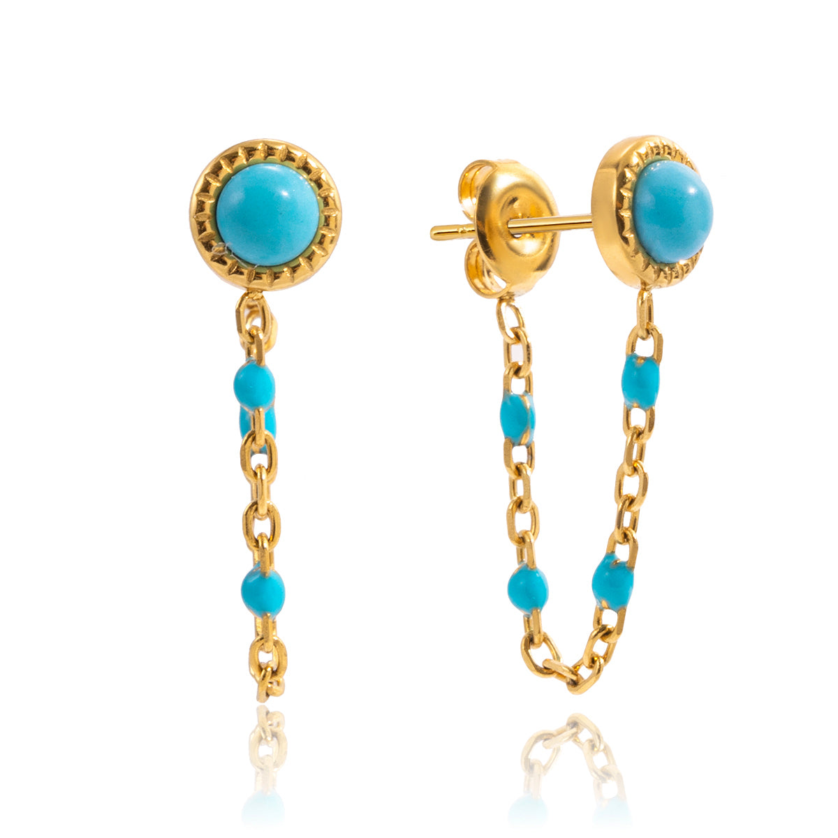 These Turquoise Chain Drop Earrings bring a soft, refreshing pop of colour—crafted with vibrant turquoise stones and gold-finished stainless steel for everyday, tarnish-free wear.